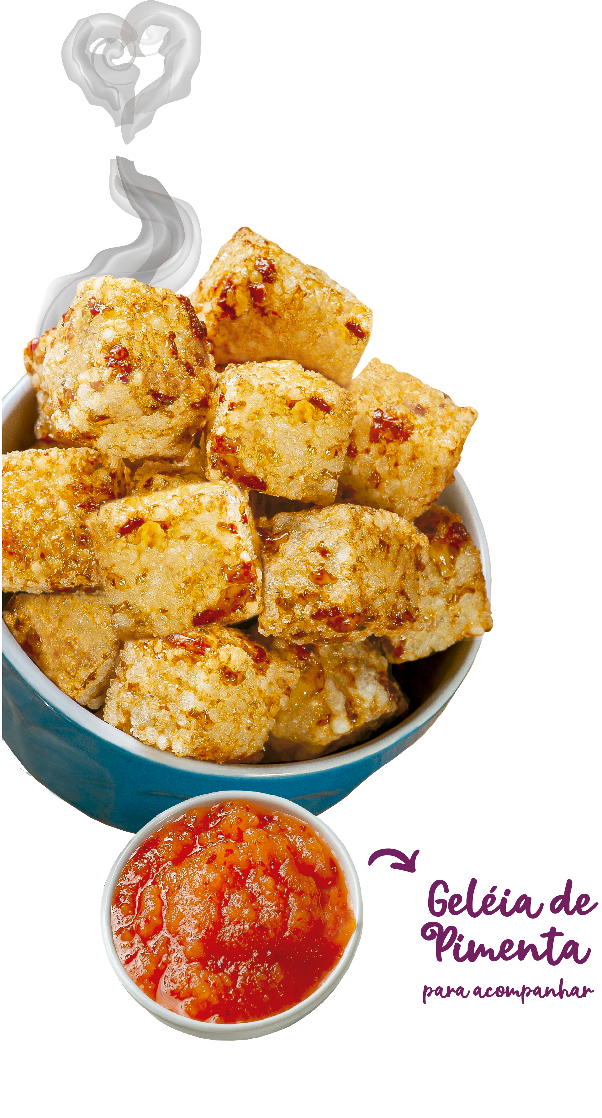 Delicioso Dadinho de Tapioca feito com tapioca granulada, leite integral, queijo coalho, queijo gorgonzola, queijo parmesão e queijo provolone.